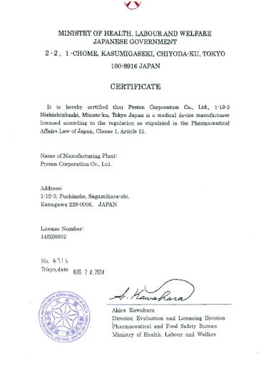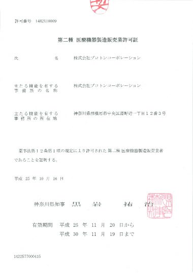 日本神奈川縣第二類醫療機器製造及銷售許可証