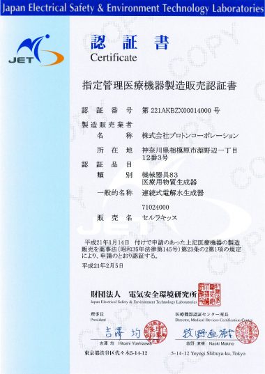電氣安全環境研究所管理醫療機器認証書