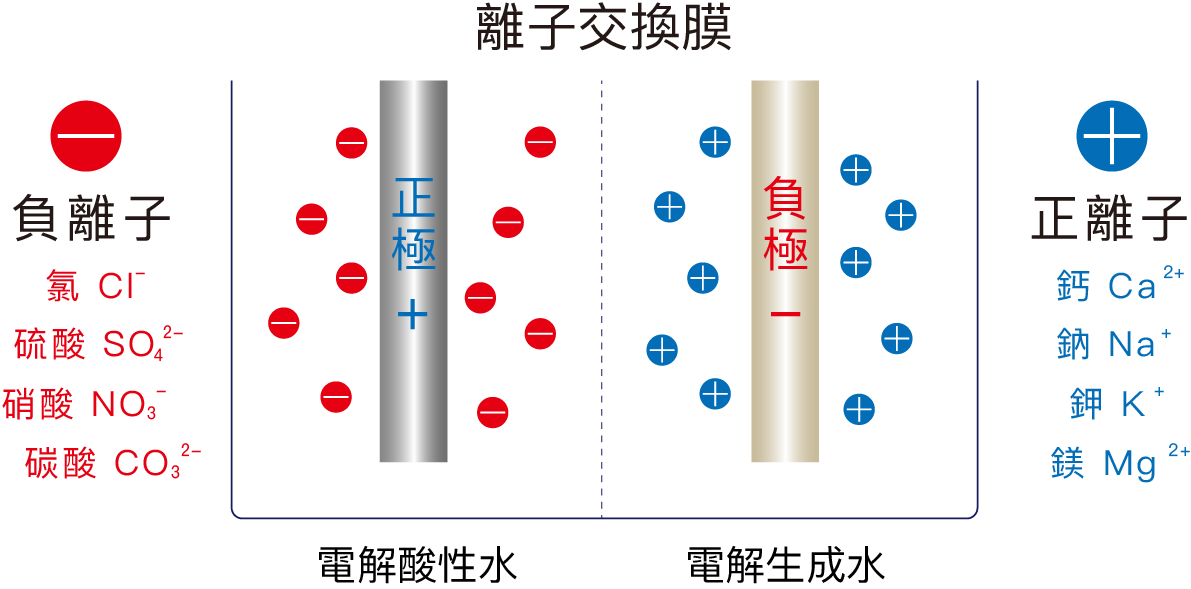 經過濾後的水會經過7塊高純度鈦白金電解板,水中的陽離子礦物質就會被離子化,鈣、鎂、鉀及鈉等會被負極吸引,形成帶負電位的電解生成水;而水中的陰離子礦物質,氯、硫酸、硝酸及碳酸等則被正極吸引,形成電解酸性水。